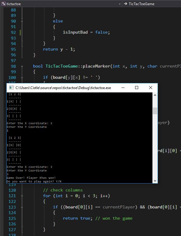 Tic Tac Toe is also very basic. The player inputs the x and y coordinates for the grid and it displays on the screen. Another player sitting next to the first player "in real life" will also use the keyboard to enter their own coordinates. This was also written in C++.